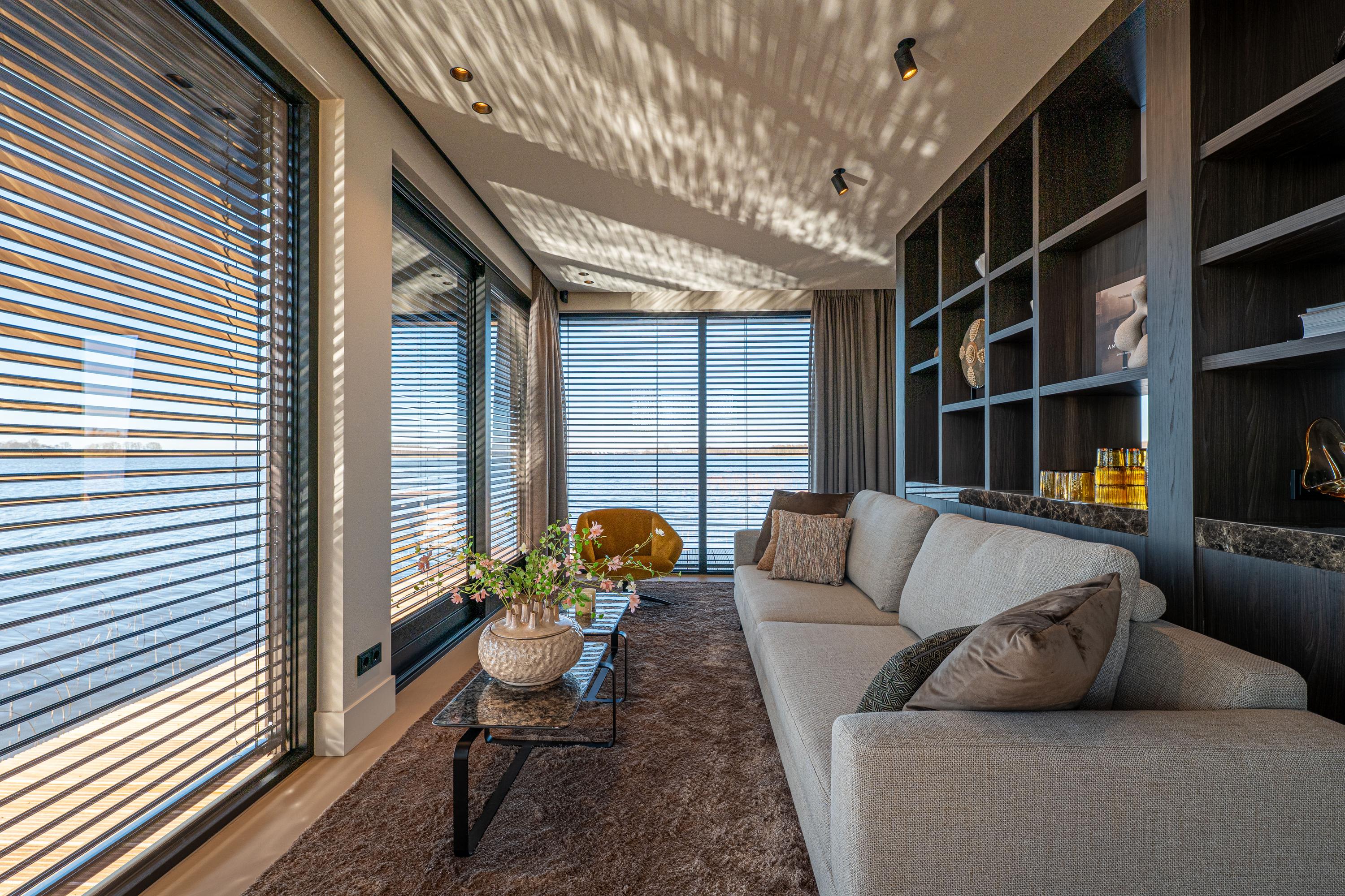De riante woonkeuken vormt het hart van de villa en biedt een adembenemend uitzicht over de serene plassen. Dankzij de grote schuifpuien aan weerszijden wordt buiten moeiteloos naar binnen gehaald, waardoor u het gevoel van wonen aan het water in zijn volle glorie ervaart. De keuken is vervaardigd van elegante dekton werkbladen en omgeven door hoogwaardige kastenwanden waarin diverse inbouwapparatuur naadloos is geïntegreerd.