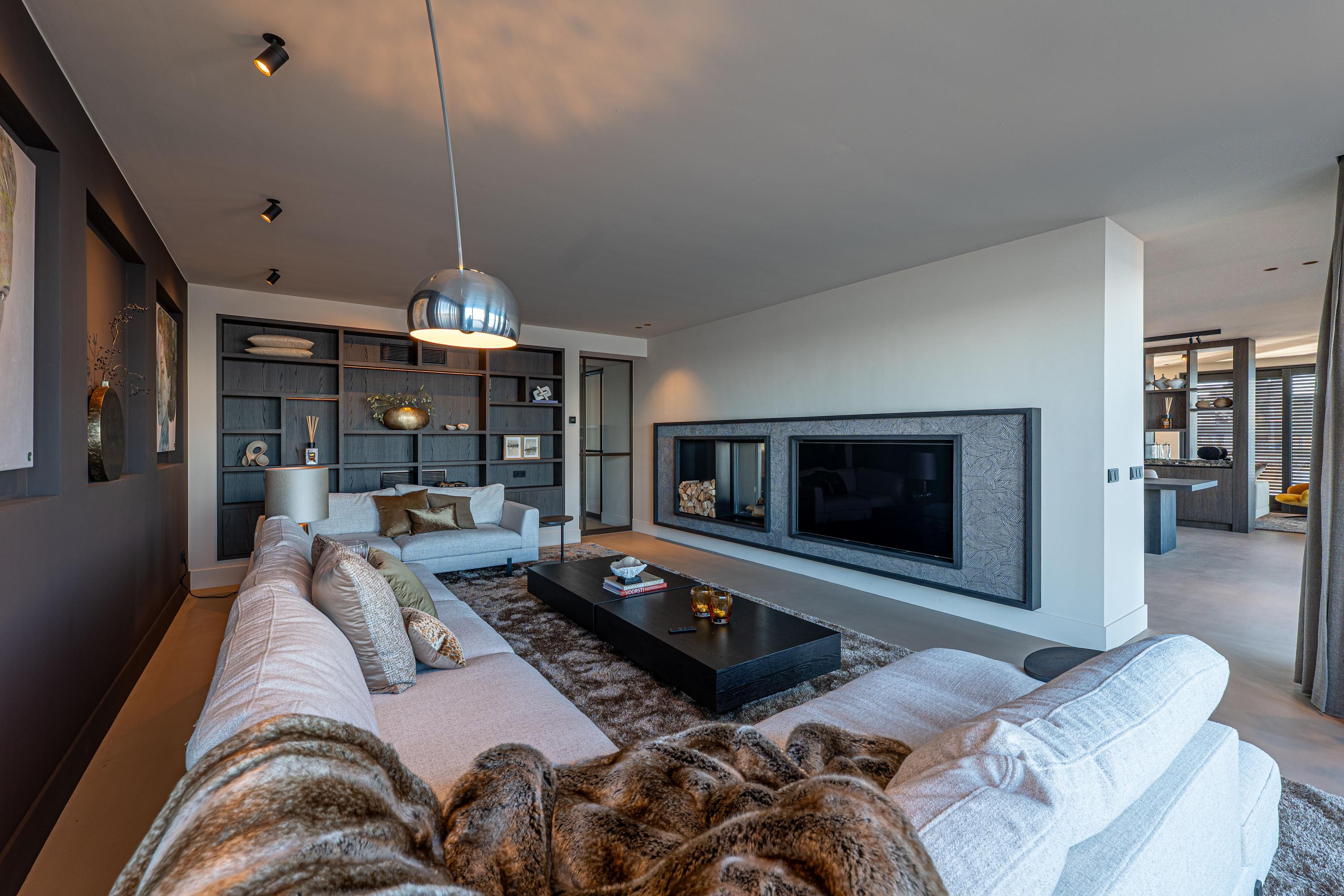 De royale woonkamer ademt warmte en stijl, met als centraal element een sfeervolle doorkijk haard (butaangas), die tevens zichtbaar is vanuit de keuken en zo een harmonieus geheel vormt.