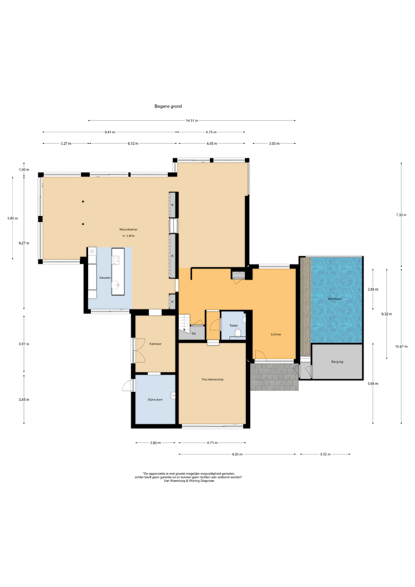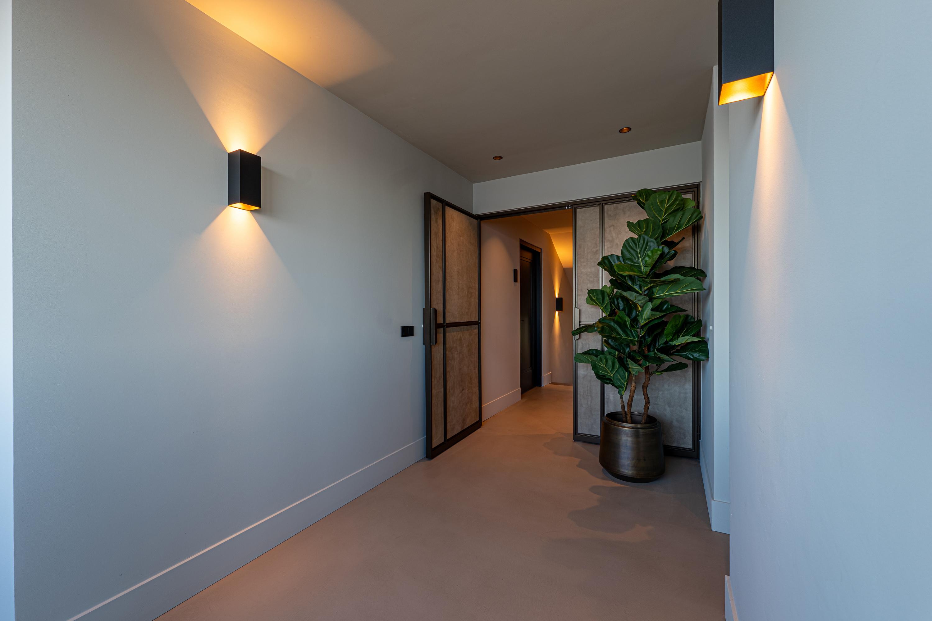 De begane grond verwelkomt u met een royale hal, waarin op maat gemaakte taatsdeuren leiden naar een stijlvolle tweede hal met garderobe, voorzien van maatwerk kasten. Aan de linkerzijde bevinden zich het toilet en de bioscoopruimte, uitgerust met airconditioning.