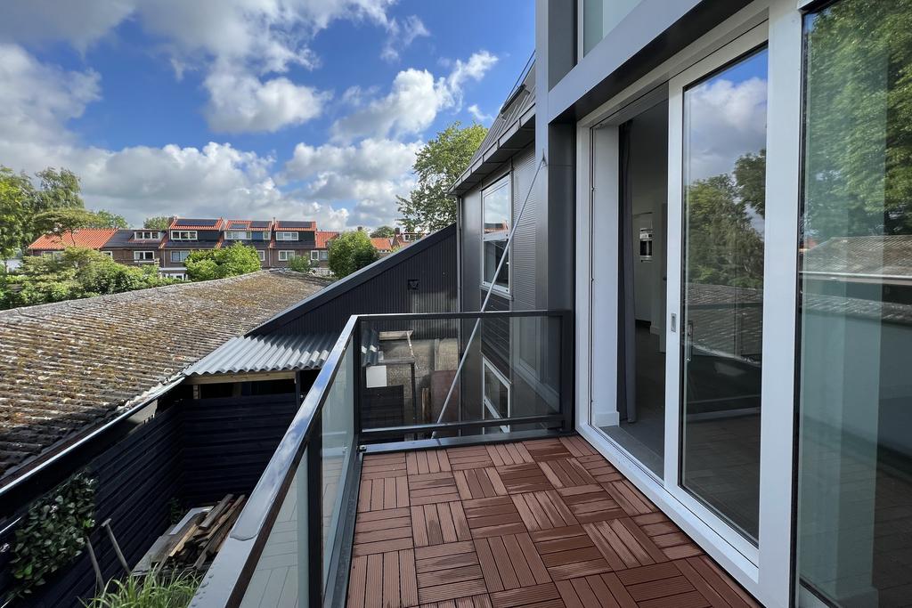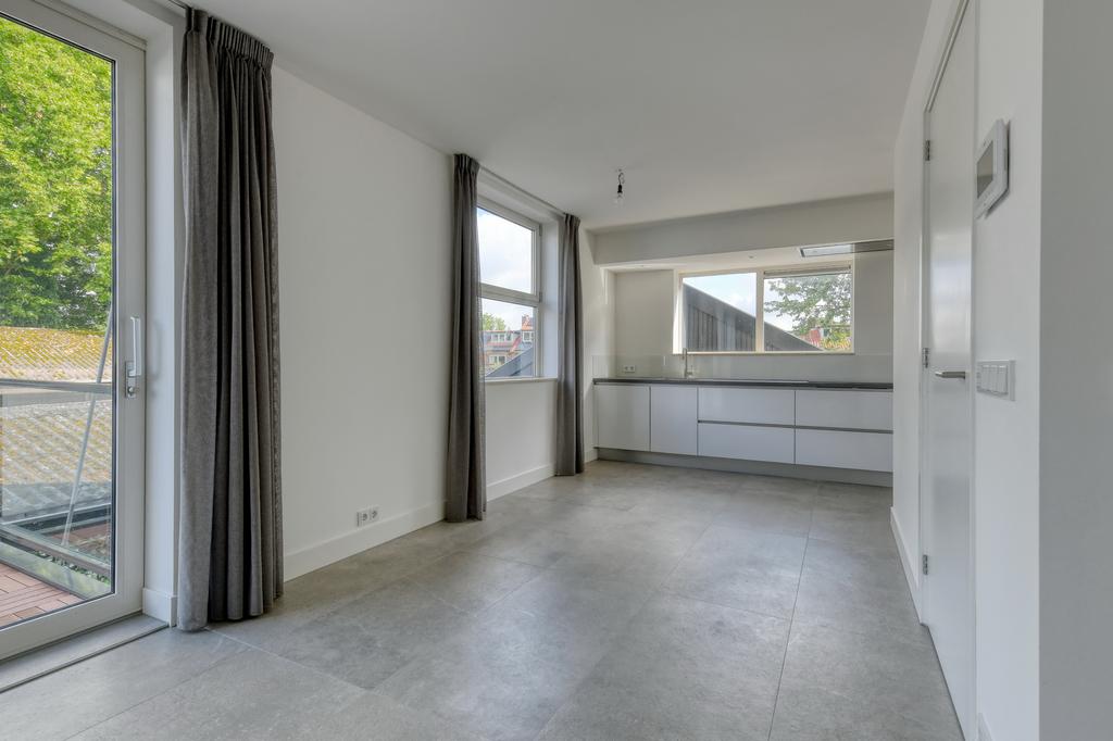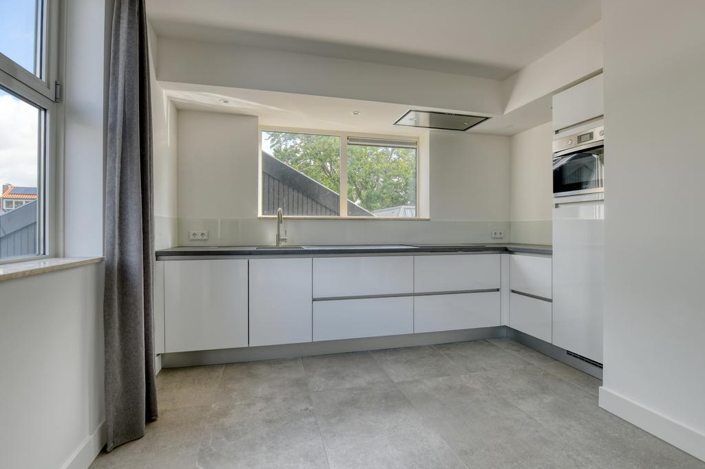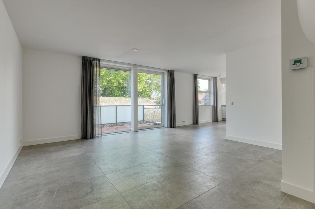 1e verdieping: binnenkomst in hal met separaat toilet, riante woonkamer met schuifdeuren naar het balkon, open keuken welke is voorzien van diverse inbouwapparatuur te weten een inductiekookplaat, combi-oven, koelkast, vriezer en vaatwasser.