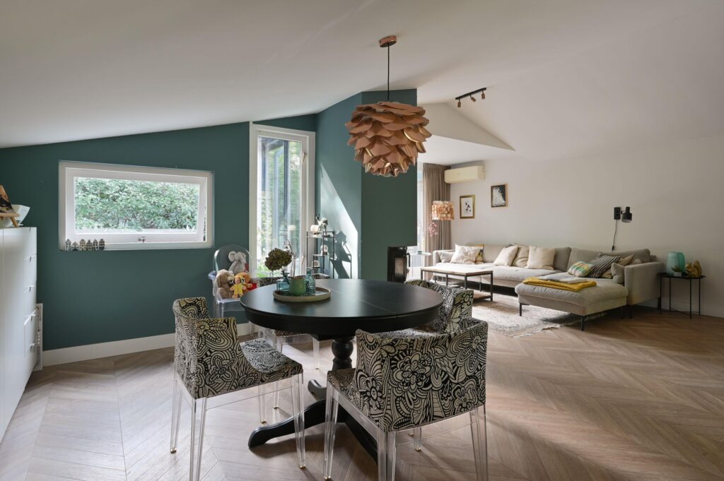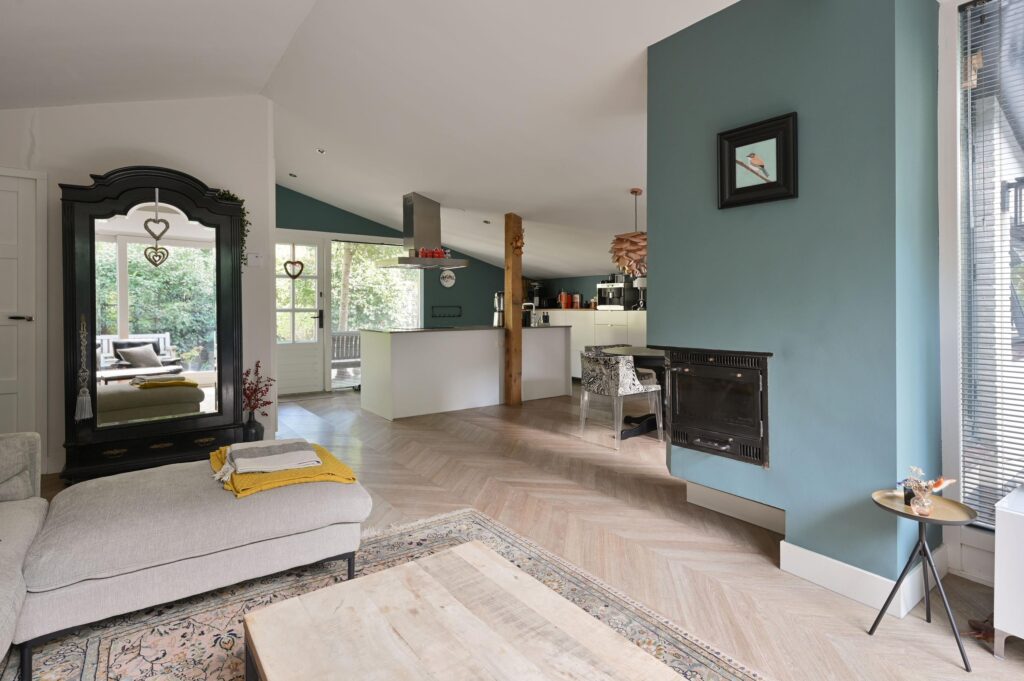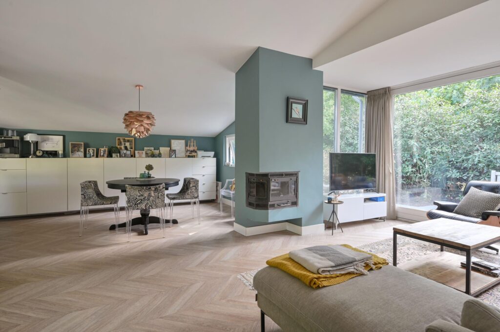 Vanuit de keuken stap je de lichte woonkamer in, waar de hoge nok (2,92 meter) direct een ruimtelijk en open gevoel geeft. Dankzij de grote ramen is dit een lichte en sfeervolle ruimte met voldoende plek voor een royale zithoek en eethoek.