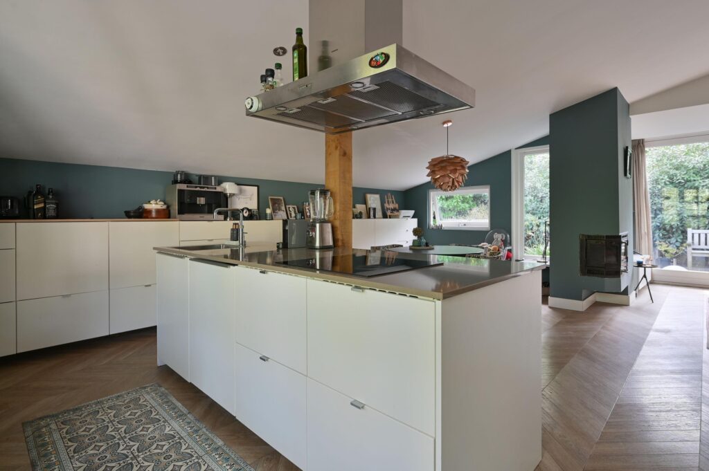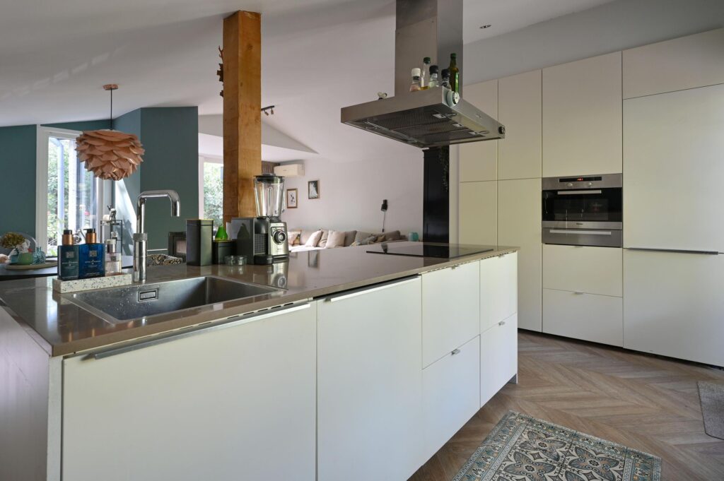 Via de keuken betreed je de woning. De keuken is ruim opgezet en voorzien van een modern kookeiland met inbouwapparatuur en openslaande deuren naar buiten, waardoor er veel licht binnenvalt.