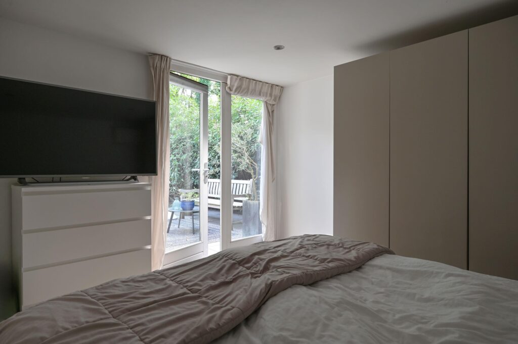 De riante master bedroom is voorzien van openslaande deuren die het een rustgevende, lichte ruimte maken.