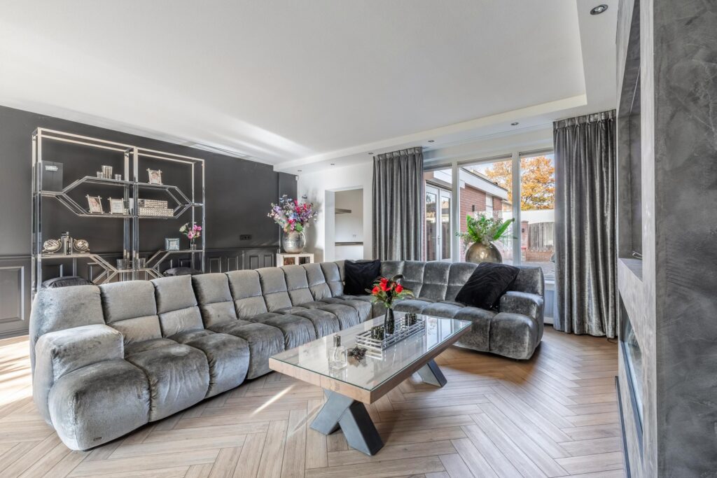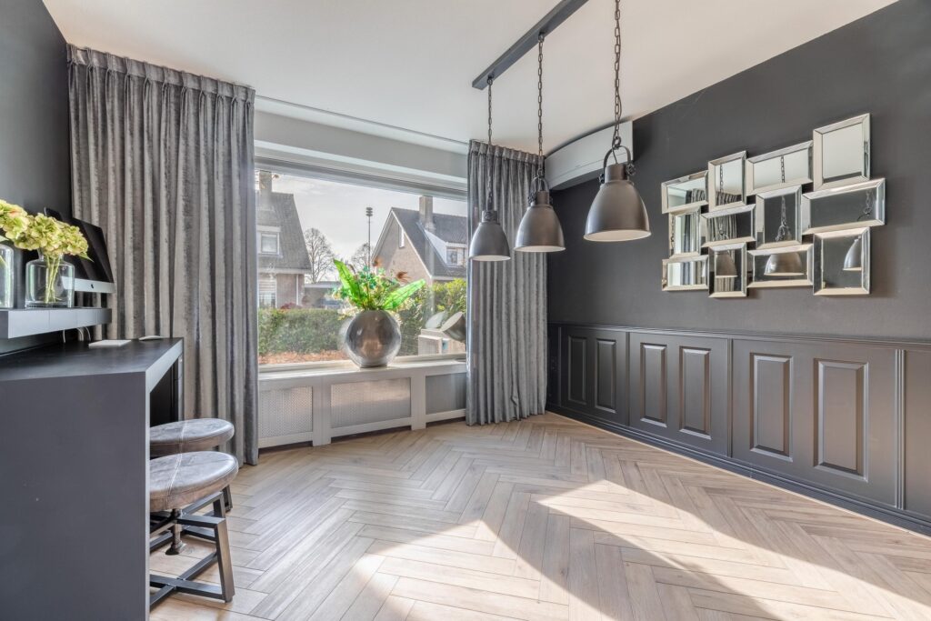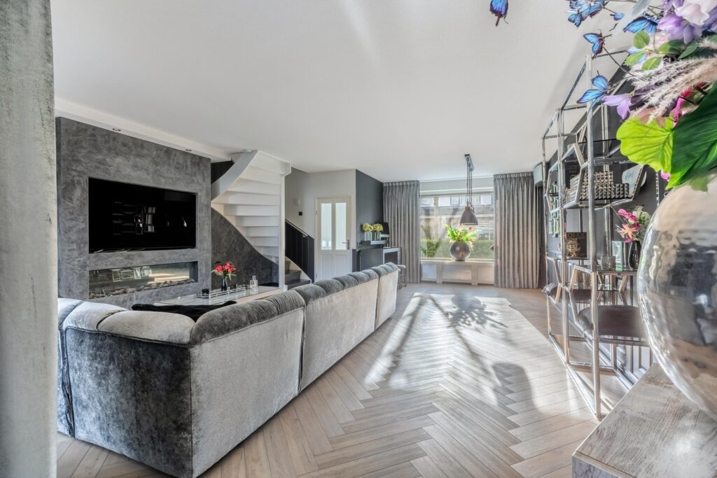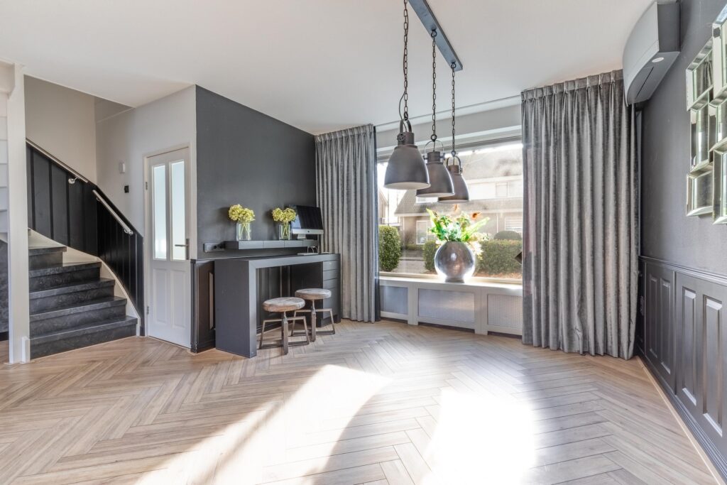 sfeervolle, royale woonkamer. De lichte woon-/eetkamer is hoogwaardig afgewerkt met een luxe visgraatparketvloer en voorzien van een stijlvolle design airco.