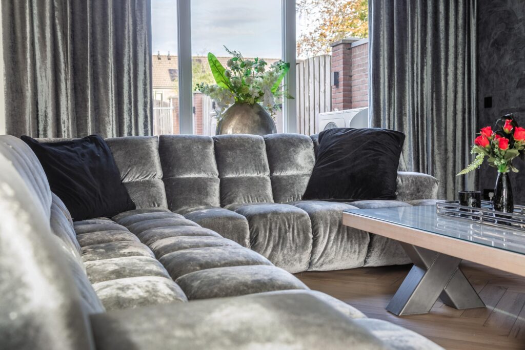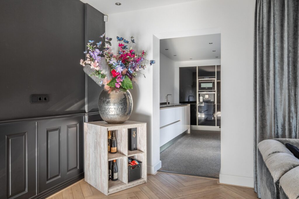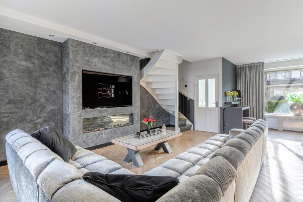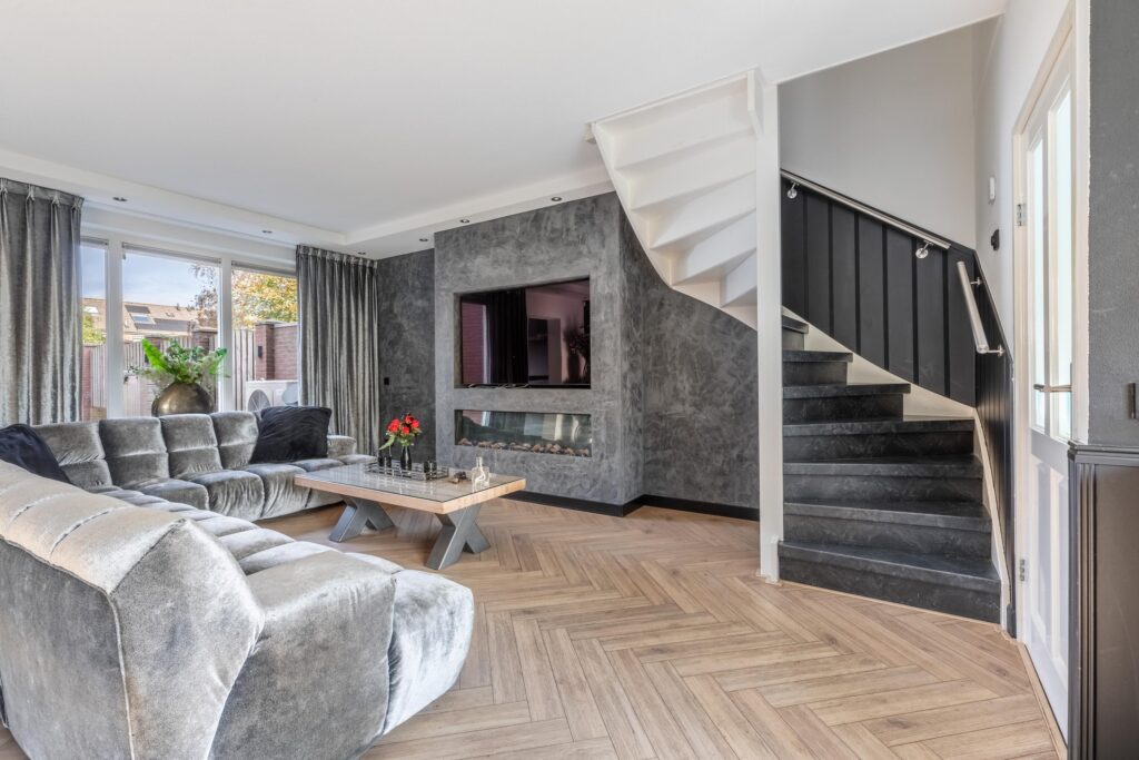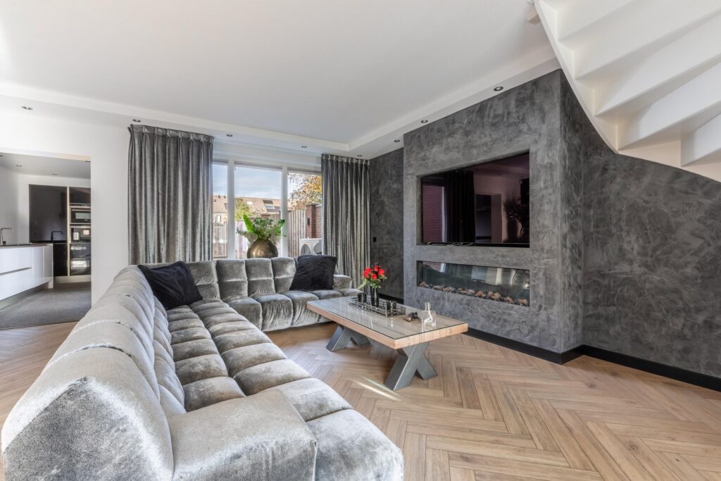 sfeervolle, royale woonkamer. De lichte woon-/eetkamer is hoogwaardig afgewerkt met een luxe visgraatparketvloer en voorzien van een stijlvolle design airco.