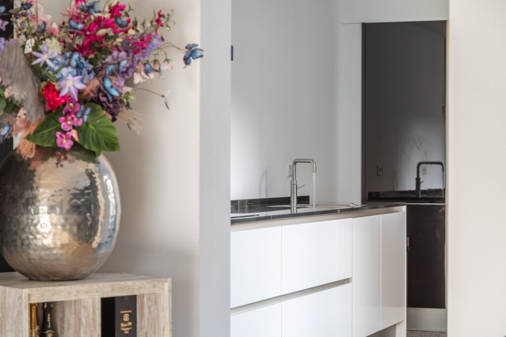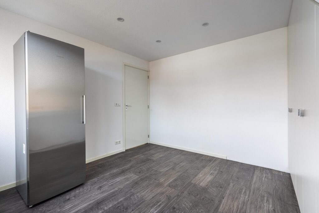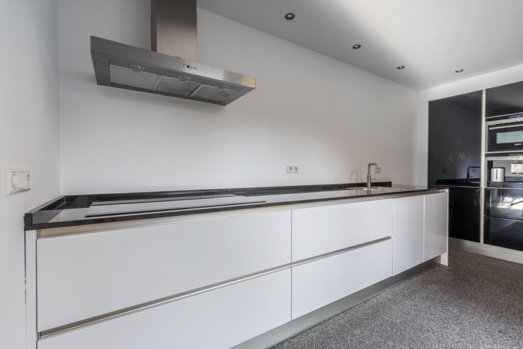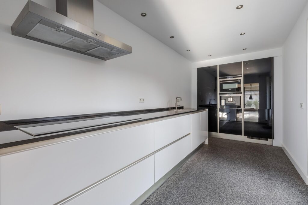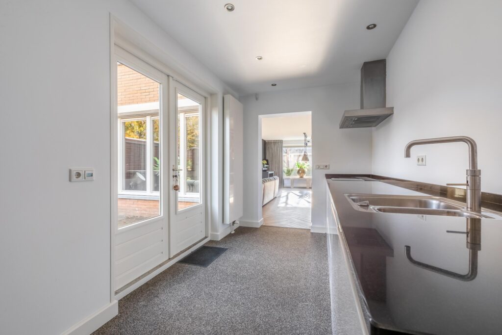 Aan de achterzijde is de woning uitgebouwd, waarbij de keuken volledig in het uitgebouwde gedeelte is gesitueerd. Deze moderne en ruime keuken is voorzien van hoogwaardige inbouwapparatuur en profiteert van veel natuurlijke lichtinval. Via de achterdeur is de zonnige, onderhoudsvriendelijke achtertuin bereikbaar.
