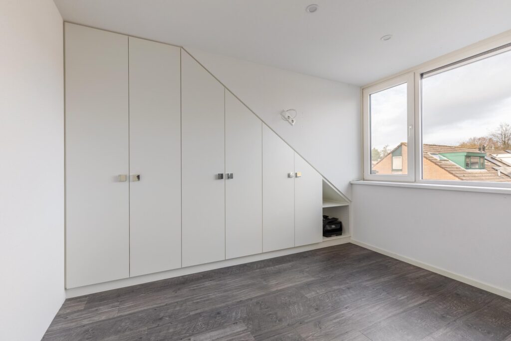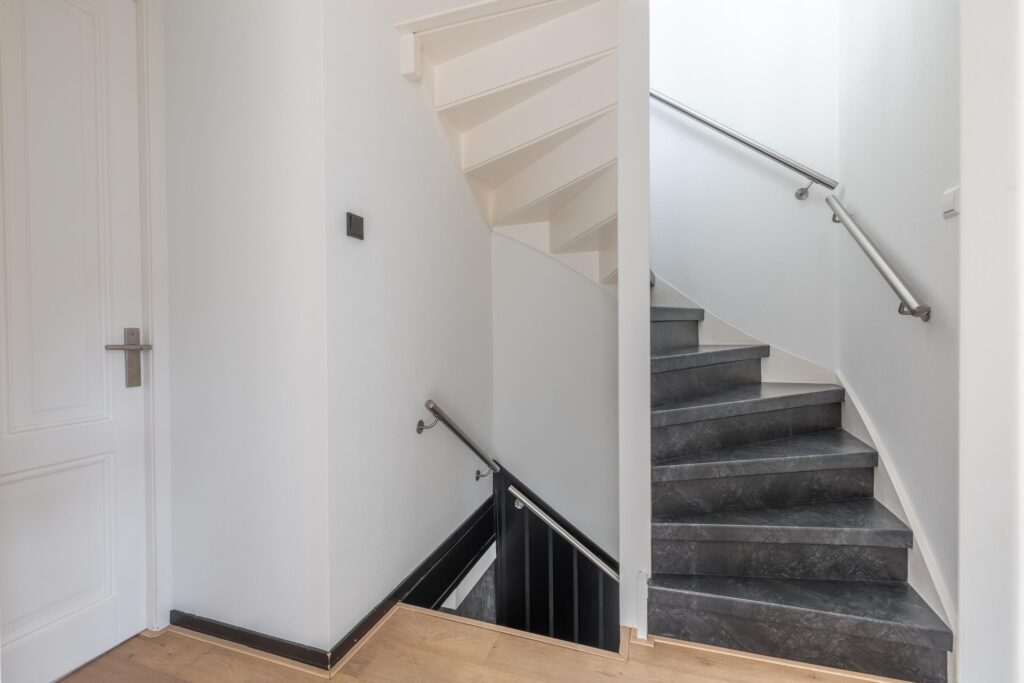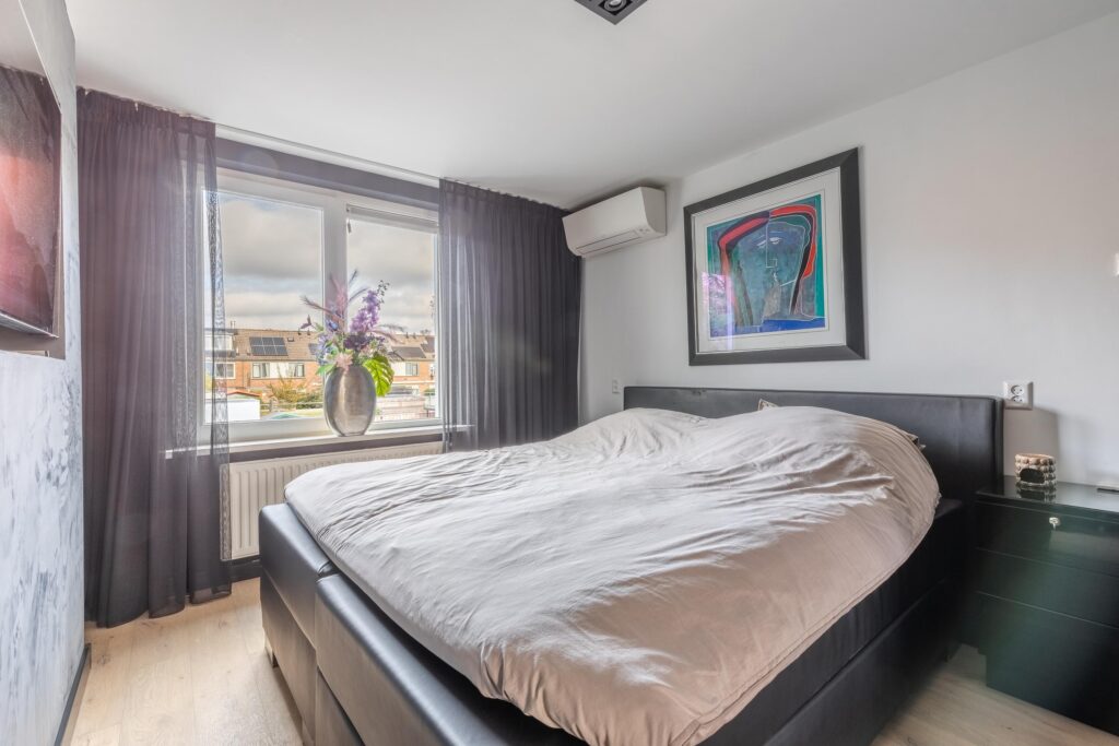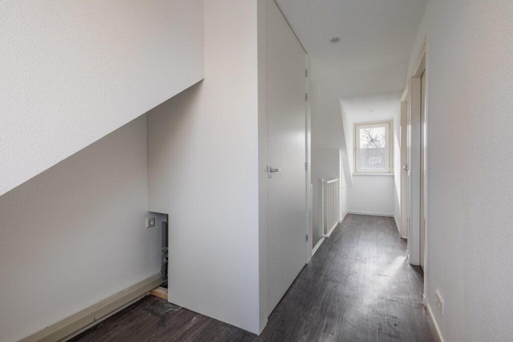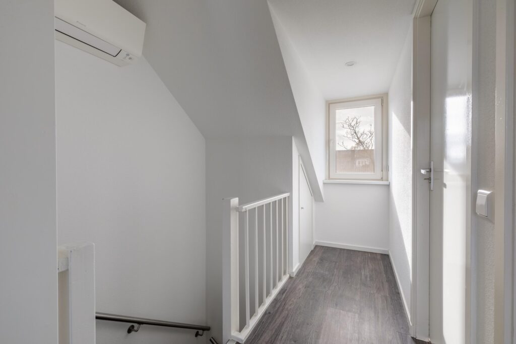 Vaste trap naar de volledig woonklaar gemaakte zolderverdieping. Hier bevindt zich een praktische overloop met ruimte voor de warmtepomp. Daarnaast zijn er twee slaapkamers, beide voorzien van een royaal dakkapel, waardoor opvallend veel licht en ruimte ontstaat.