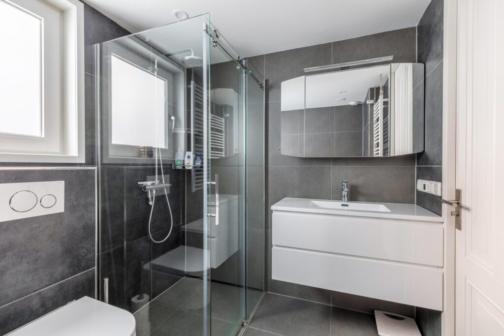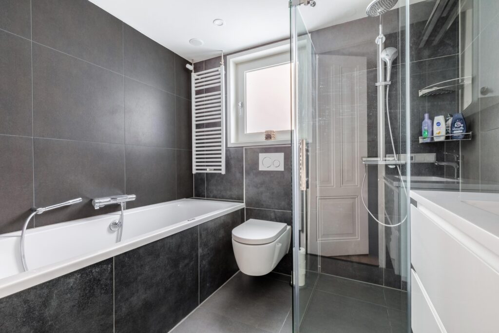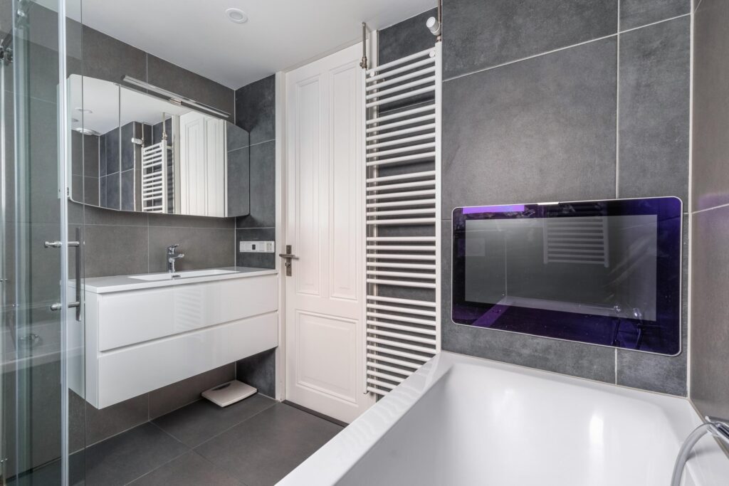 De moderne badkamer beschikt over een ligbad, inloopdouche, tweede toilet en luxe wastafel.