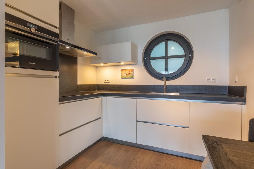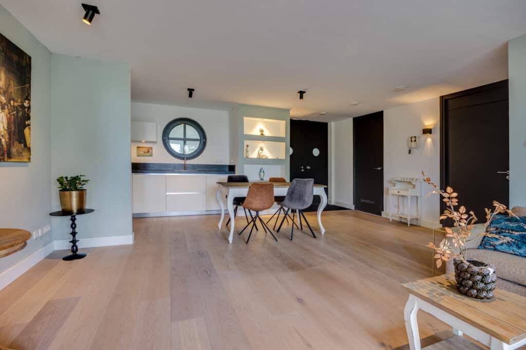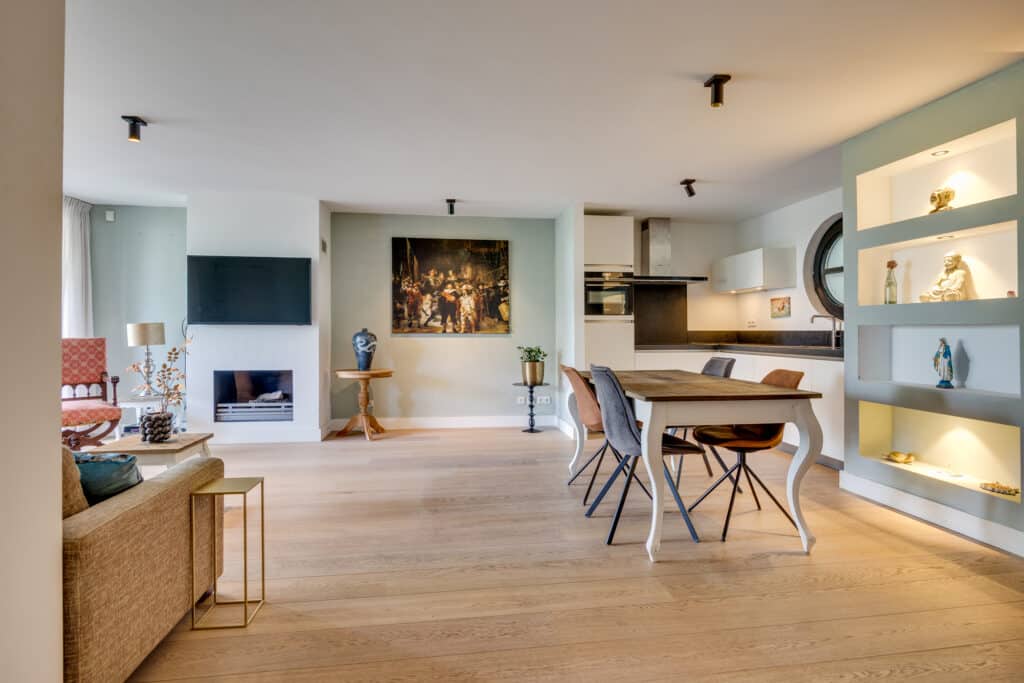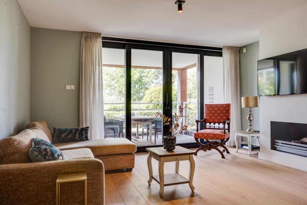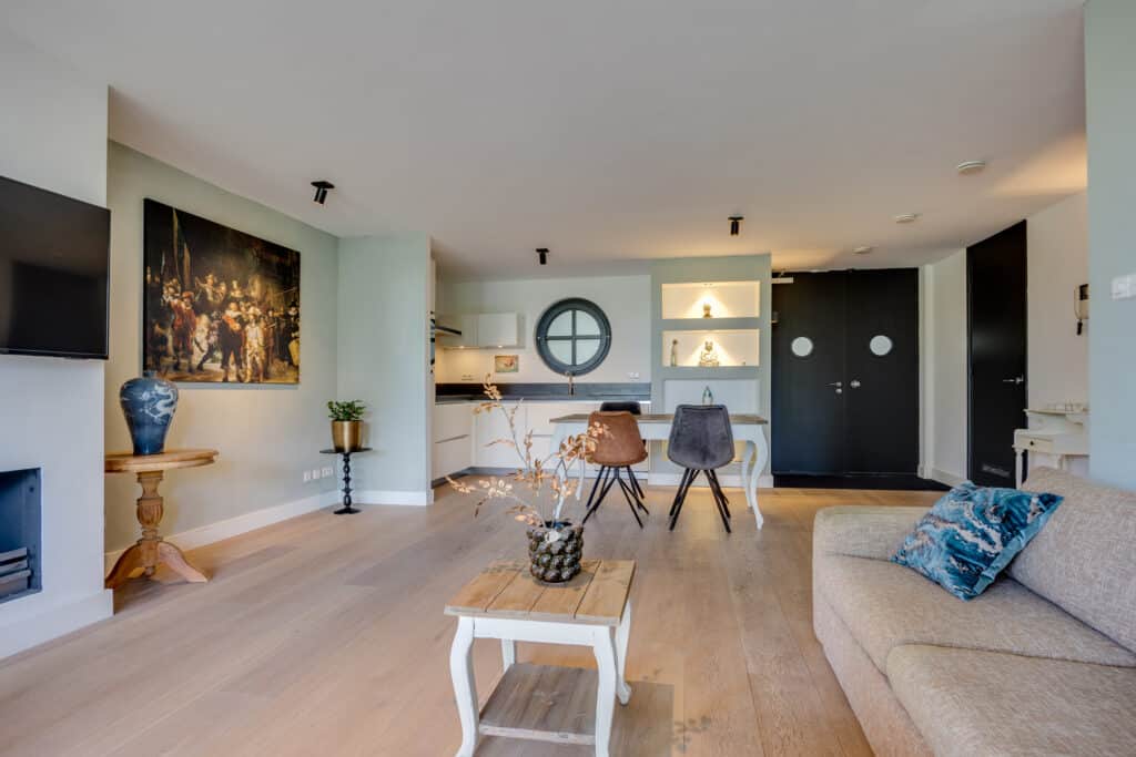 Toegang tot het appartement op de begane grond in de stijlvolle living welke is voorzien van eikenhouten vloer en gezellige gashaard. De keuken aan de achterzijde is uitgerust met divers inbouwapparatuur zoals een Quooker, koelkast, vaatwasser, inductiekookplaat en oven.
