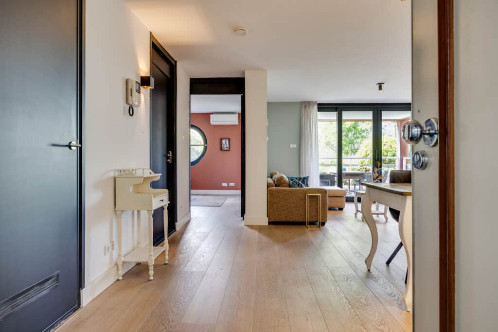 Binnenkomst in de gemeenschappelijke beveiligde entree welke toegang geeft tot de stijlvolle centrale ontvangsthal met zitbanken en gashaard. Lift en trappenhuis met toegang naar zowel de appartementen als de ondergrondse parkeergarage met bergingen en fitnessruimte.