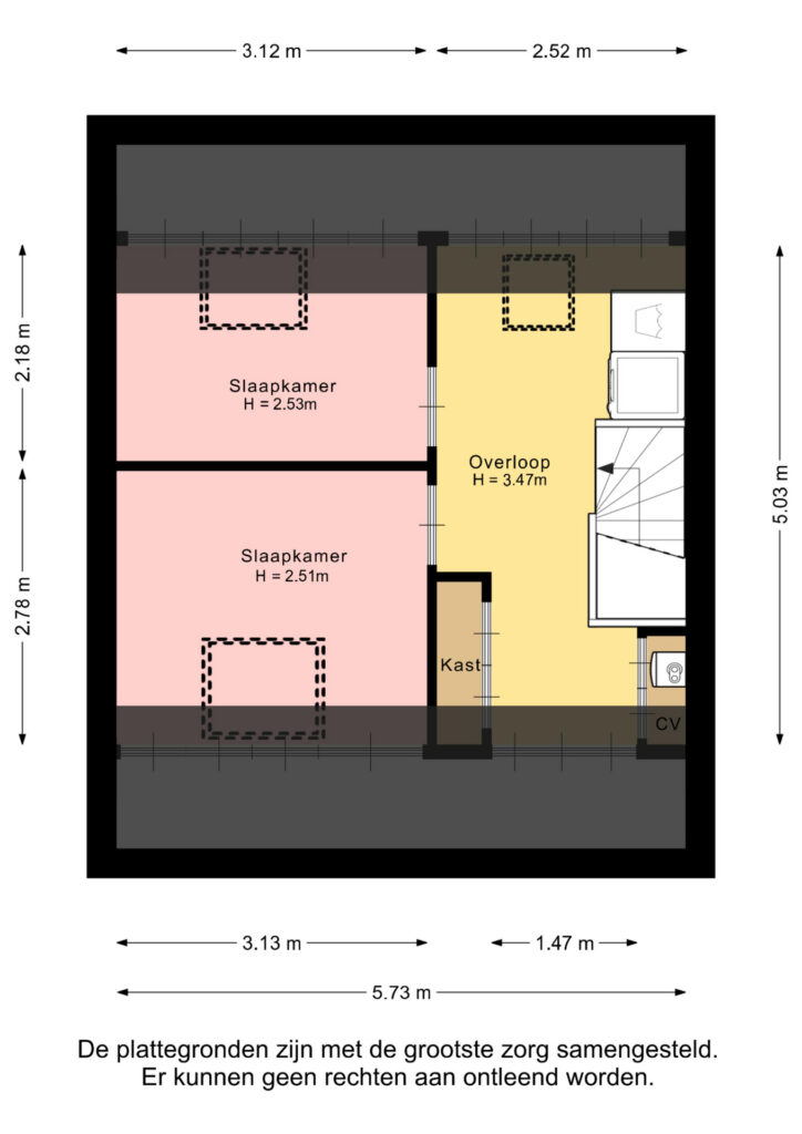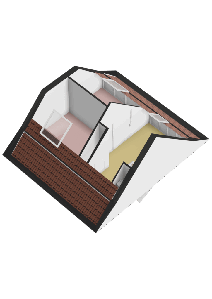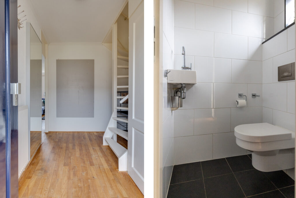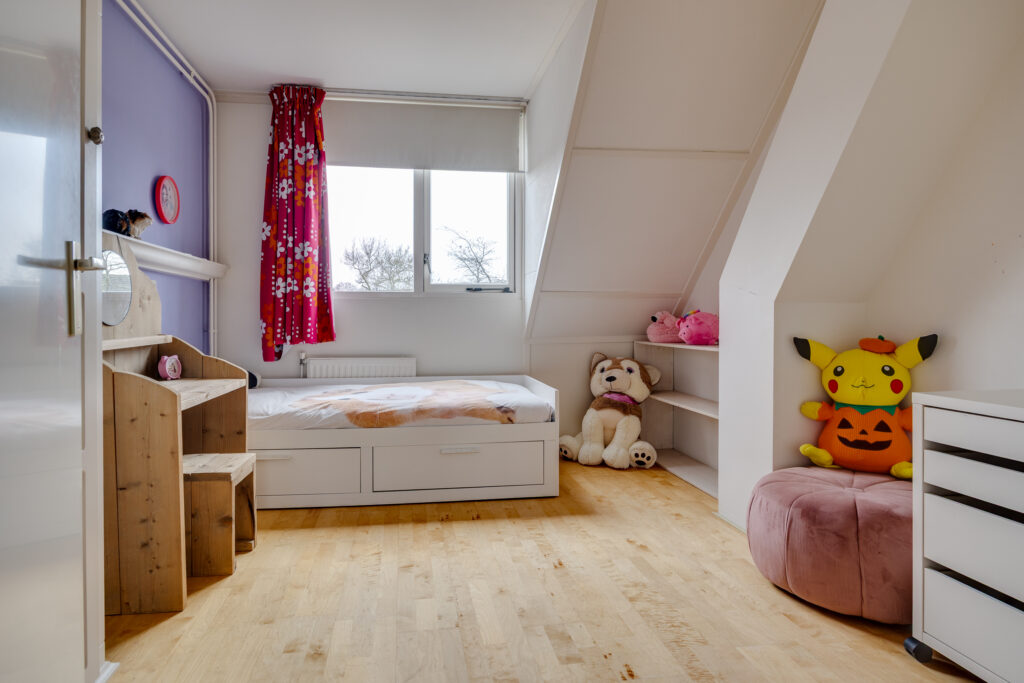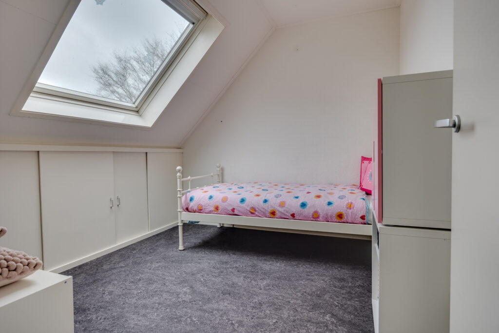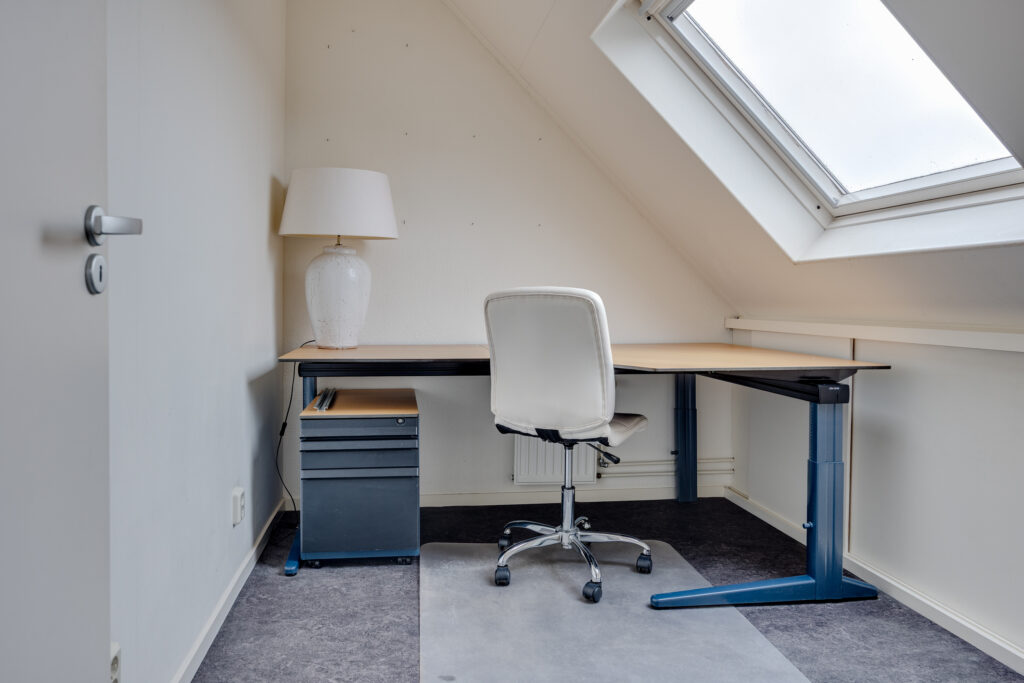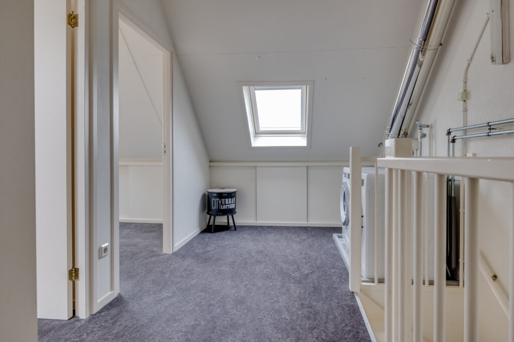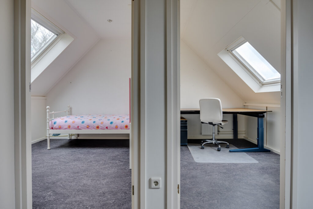 Via een vaste trap bereik je de zolderverdieping met een ruime overloop met Velux dakraam. Hier bevinden zich de opstelling van de CV-ketel en de aansluitingen voor wasmachine en droger. Daarnaast zijn er nog twee ruime (slaap)kamers, beide met dakraam en veel bergruimte achter de knieschotten.