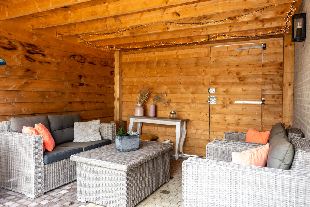 • Diepe, zonnige achtertuin op het zuiden met berging, overkapping en achterom